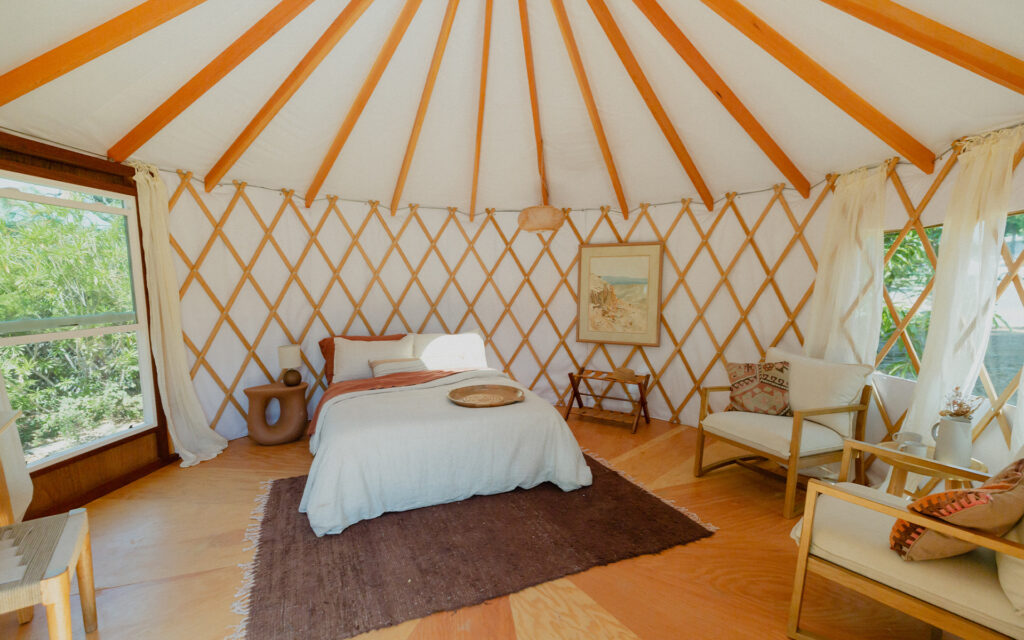 Yurts occupy that happy space between tent and home where the synergy among space and design feels almost harmonic, like a well tuned “Om” or a low-tone wind chime––what the Japanese call “Forest Bathing,” or Shinrin Yoku–– it’s the awareness that nature has a psychological and emotional affect on our well-being. Maybe it’s the canvas roof, maybe it’s the lattice walls, maybe it’s the natural textures, the fir, the bamboo, the platform wood floors, the desire for macrame and hide-skin rugs; maybe it’s the sacred geometry of being encircled, with little between us, by trees, mountains, and open air. Maybe it’s the reassurance of knowing we’re closer, to a world that so often feels “outside,” or maybe, just maybe, while traditional homes are generalists, yurts are an opportunity to make space, with unique clarity, for what most fuels us. A chance at specificity in our own backyard.