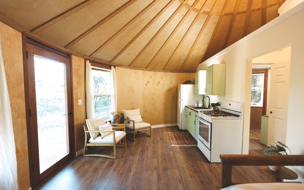 After nine years of production, Caleb’s product line is expanding to include their long awaited Rigid Wall Yurts, what he and Sara DaSilva (General Manager and Head Yurt Wrangler) are calling, “The Round House.” The new yurts offer all the incredible design elements of the Lattice Wall Yurts, but with the efficiencies and insulation required to meet city code as a habitable primary or Accessory Dwelling Unit (ADU), and if needed, can be financed with a construction loan. “Our lattice wall yurts are great for artist studios, yoga studios, makers spaces, classrooms, playrooms, workspaces, and event space,” says Caleb, “They’re affordable, easy to put together, and a great auxiliary space. But for folks who are wanting to live in the yurt, or offer long-term accommodations for guests, renters, or out-of-towners, our new Rigid Wall Yurt meets the energy, efficiency, and structural load requirements of a fully permit-able habitable dwelling.”