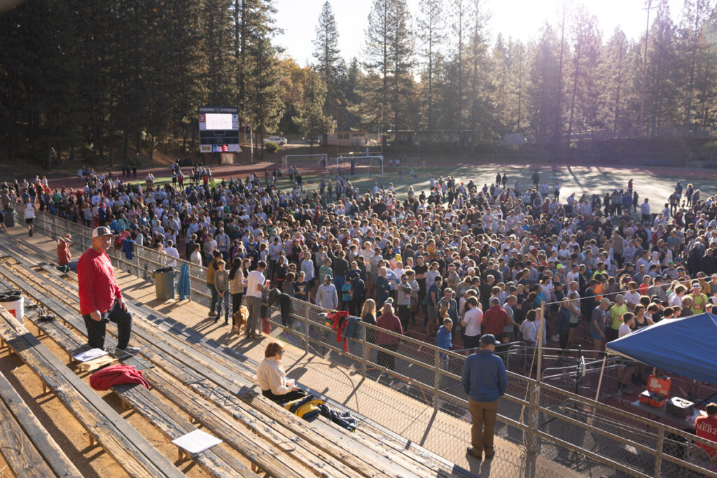Mike Bratton stands before a quiet crowd in the Nevada Union bleachers on a chilly Thanksgiving morning, microphone in hand, just minutes before a starter’s pistol will usher a staggering 2,500 runners, walkers, joggers, parents, kids, strollers, teens, and young adults, across a 5k/10k starting line on Nevada Union High School’s red-tartan track in the name of community and mental health.