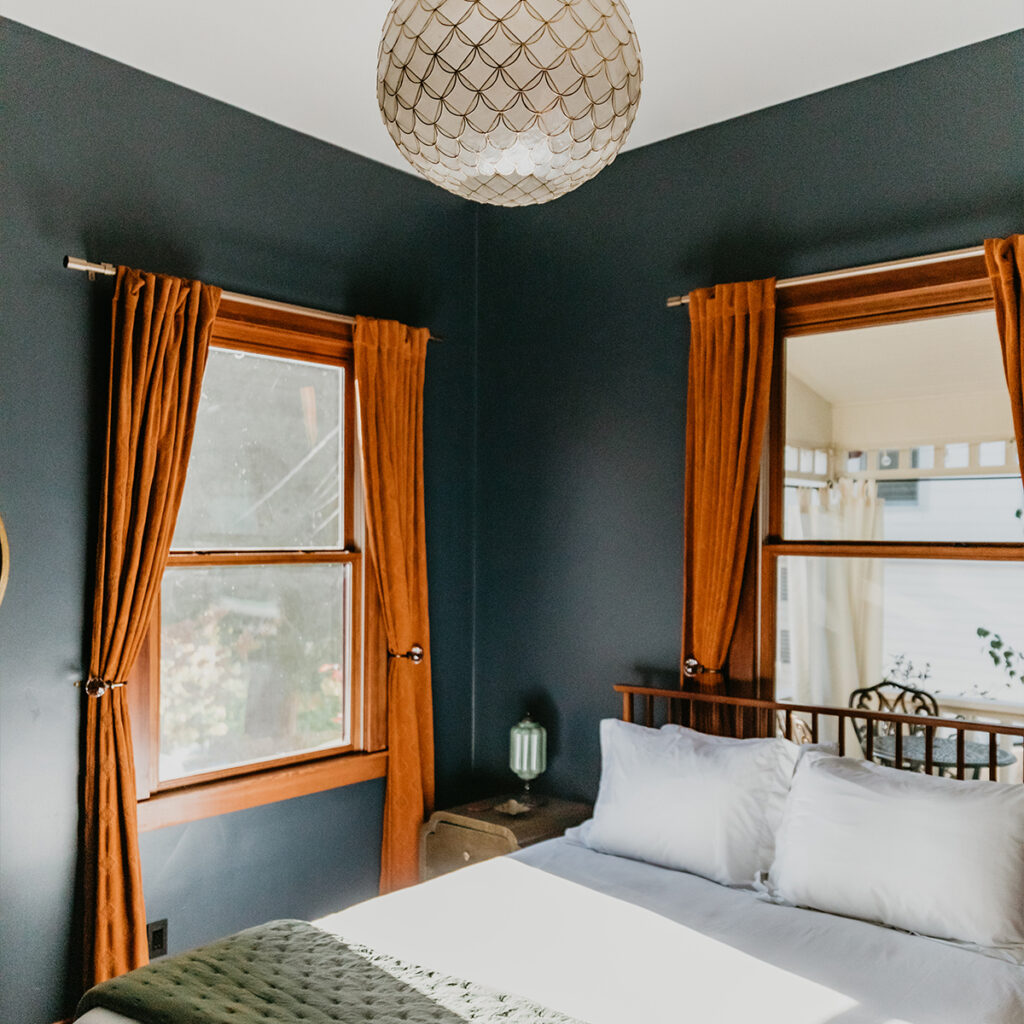 Dark navy walls, deep orange curtains, butcher-block counters, an attic shower with an oversized skylight (to watch the stars, of course), a corrugated metal fence, a dash of bronze, and the revival of Victorian drama make Moonrise on Mill St. the deeply moody “off-Broad Street” Inn nestled discreetly in the heart of Nevada City’s downtown. “I wanted a design project,” confesses Jess Witte, host, owner, designer, Grass Valley local, and self-proclaimed city-girl with 75 countries to her name. “I lived in Korea for a year, I lived in Wales for a year; I’m so inspired by international cultures; what they’re eating, their lifestyle, the design of their cities and homes––but the beauty is always what I take in first.”